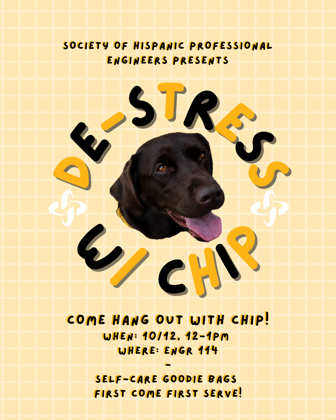 Come hang out with Chip and the SHPE crew! There will be goodie bags, first come first serve. Invite your friends, we hope to see you there!