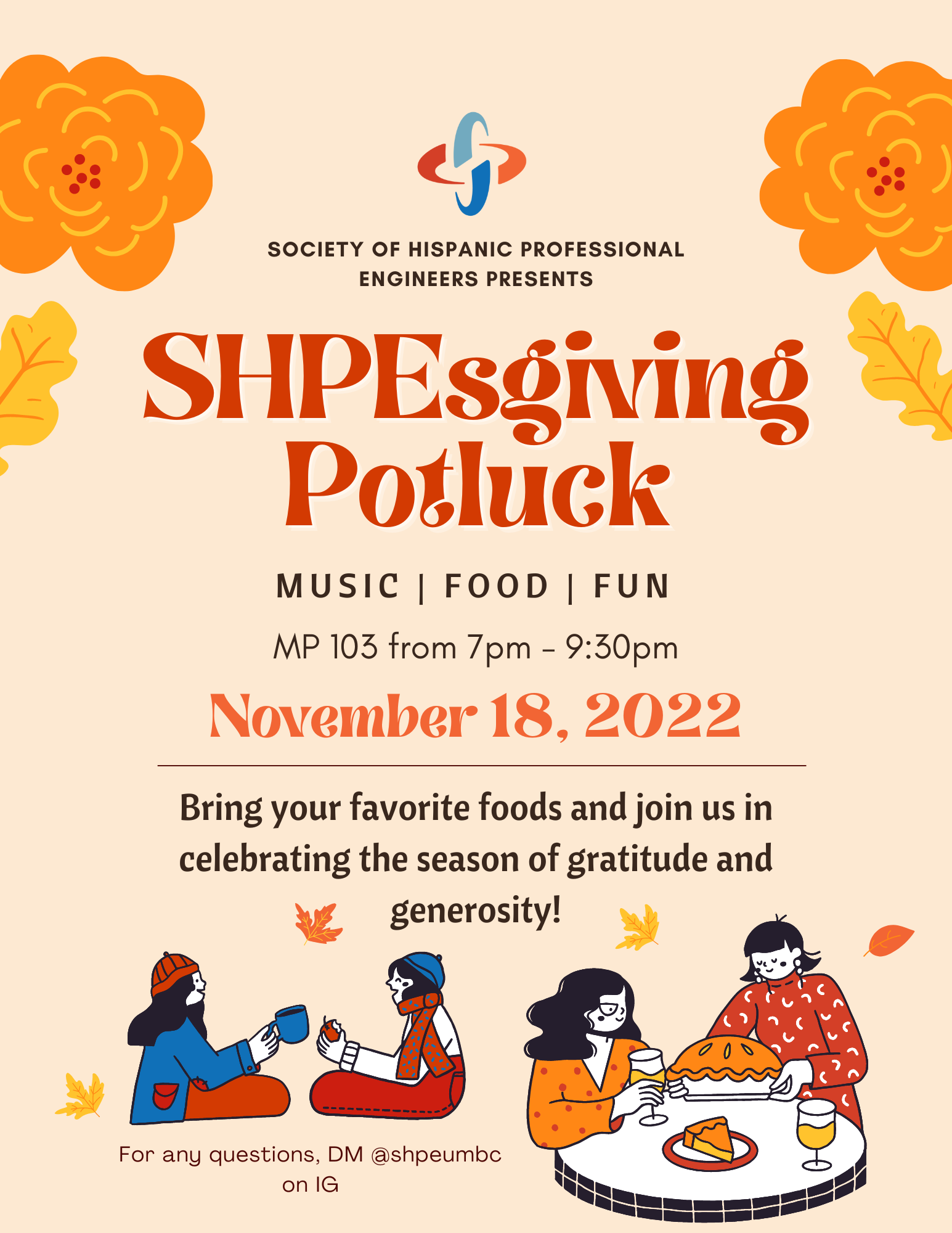 The Society of Hispanic Professional Engineers will be hosting a SHPEsgiving Potluck! Come out and celebrate our different cultures and foods for a Thanksgiving holiday event. Food is free, but please bring a dish to try other dishes in order to ensure there is enough food to go around.
