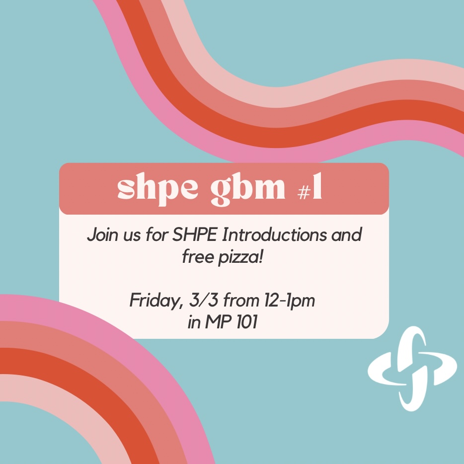 TODAY is the first SHPE GBM of the spring semester! Join us for free pizza, introductions to SHPE, learn more about our incoming events, and play a fun SHPE Kahoot game.